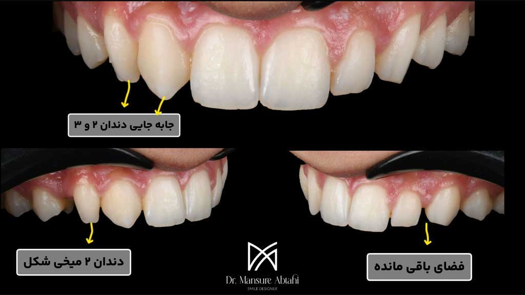1. به‌علت شرایط دندان‌ها متخصص ارتودنسی مجبور شدند که (در سمت چپ) دندان شماره ۲ و ۳ را به‌جای هم قرار دهند.