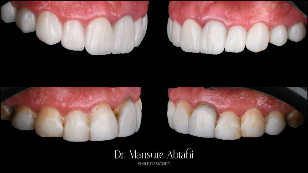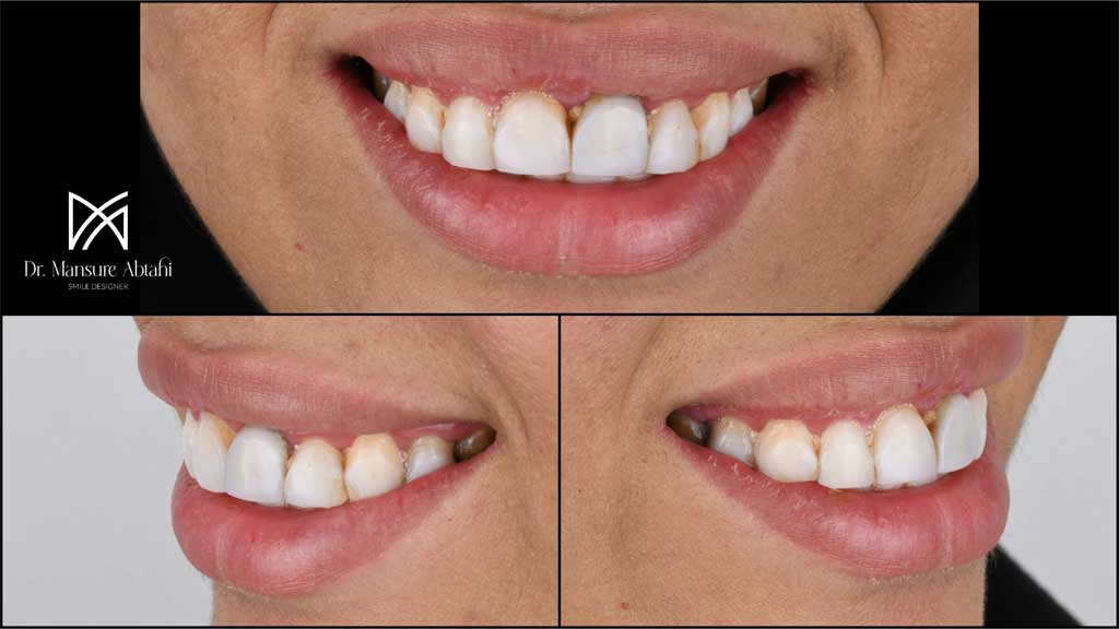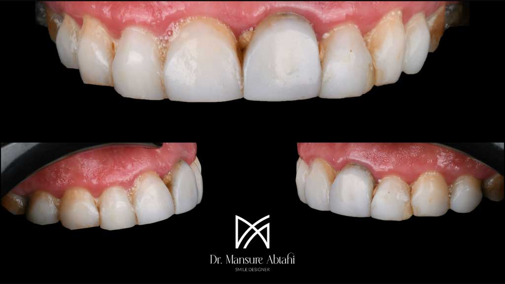 با توجه به وضعیت دندانها (که شامل ترمیمهای متعدد قبلی بودند) و سازگاری بیشتر سرامیک با بافت لثه، تصمیم گرفتیم که کامپوزیتها را ریمو کنیم و با لمینیت سرامیکی جایگزین نماییم.